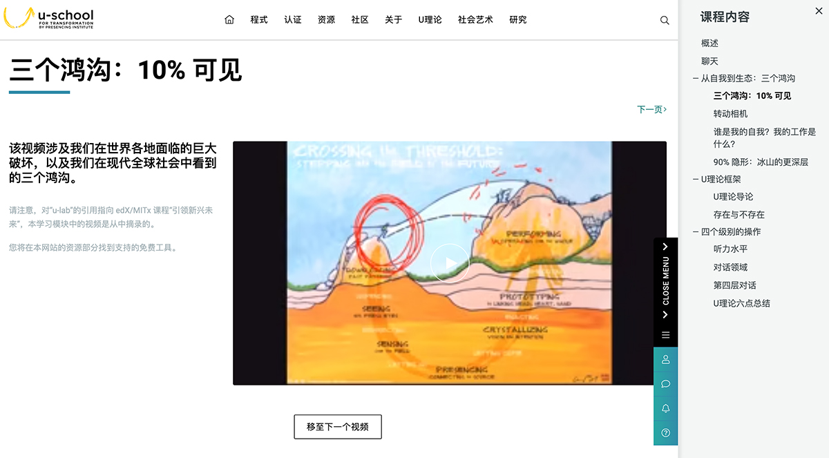 这是一门90分钟的免费课程,向你介绍U理论,这是一种基于奥托·沙尔默(Otto Scharmer)和麻省理工学院(MIT)同事的工作指导和支持系统变革的框架和方法。u-lab0x是一个通往更远旅程和新兴全球网络的入口&完成本课程后,你将有机会加入这两个网络。