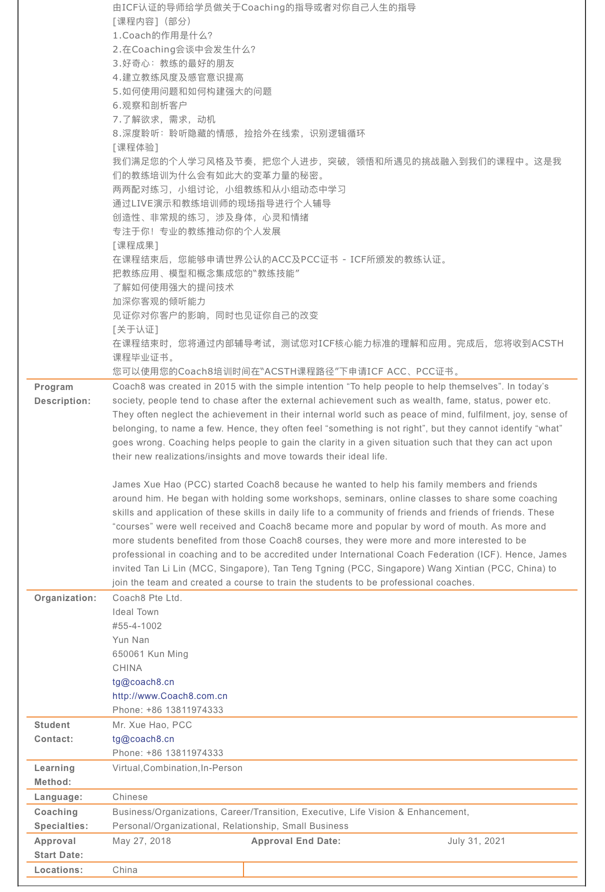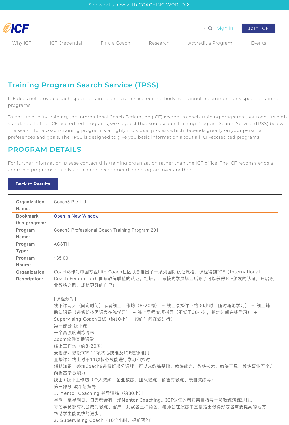 Coach8国际认证课程CPCT201在ICF的官网的登记信息