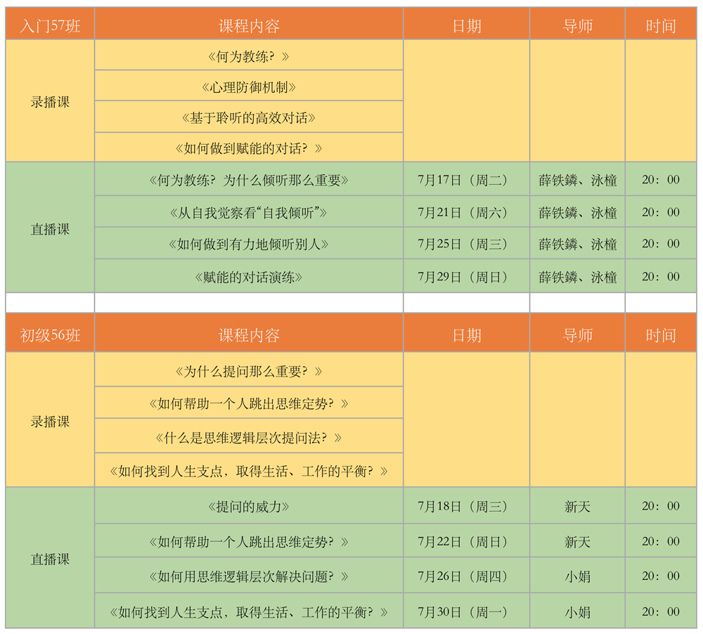 2018年7月入门、初级班课程时间安排表