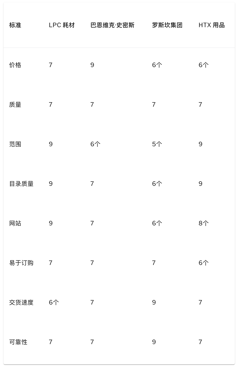 然后,他使用自己确定的标准对 LPC 及其竞争对手进行排名。他客观地评估了一些标准,而在其他标准上,他依靠直觉、市场声誉和销售人员的报告。这为他提供了下表中的信息:
