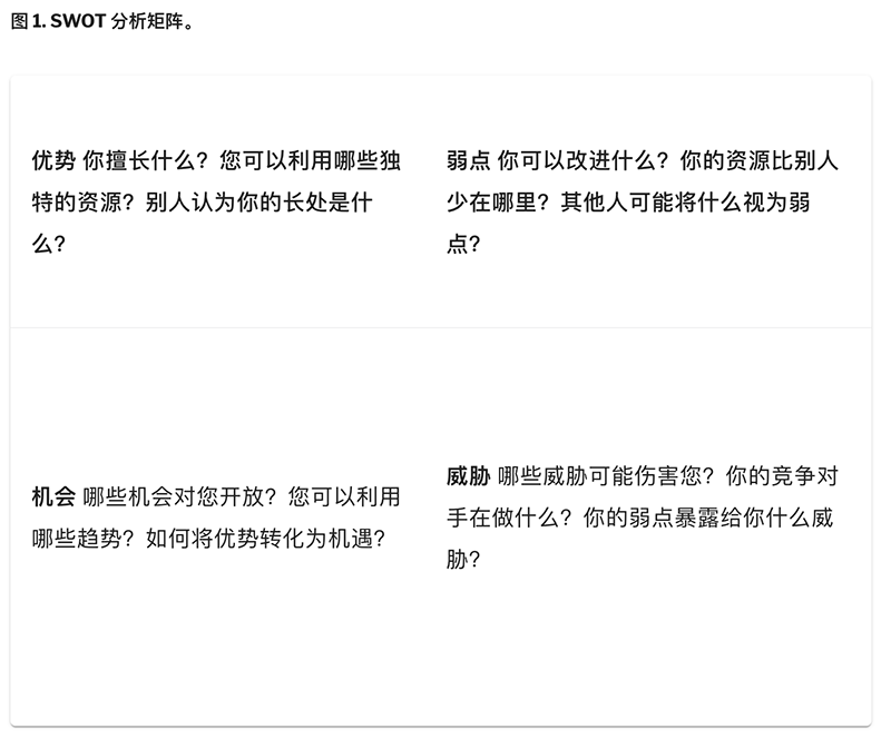 SWOT 矩阵是一个 2x2 的网格,一个正方形代表 SWOT 的四个方面。(图 1 显示了它应该是什么样子。)每个部分都以一些问题开头,以帮助您开始思考。