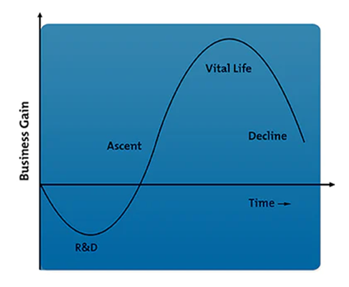 技术生命周期*,如下图 1 所示,说明了创新的典型生命周期,从概念到衰退。它可以帮助您了解您可以从新产品中获得的商业收益,并预测您何时能够从中获得可观的利润。