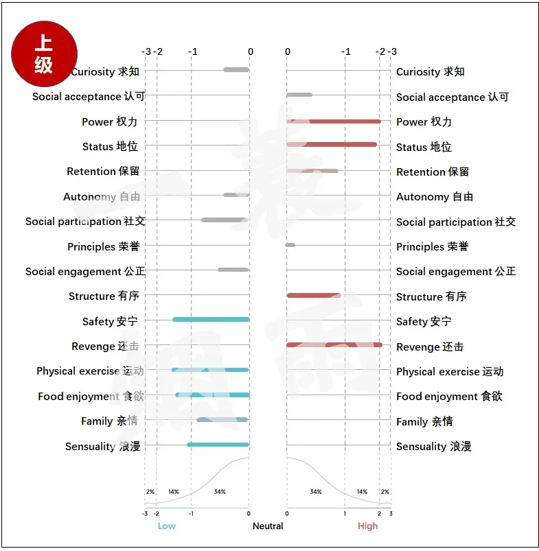 不难看出上级的【权力】、【地位】、【还击】都是高红,那她对于事情的掌控欲是非常强烈的,且对于工作的结果产出要求很高。