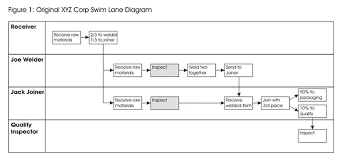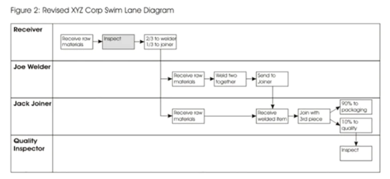 一般来说,流程图是发现处理差距和效率低下的好工具。Rummler-Brache 或泳道图方法的额外优势是它专注于部门和团队之间的高风险互连,并允许您发现任何相关的问题和风险。