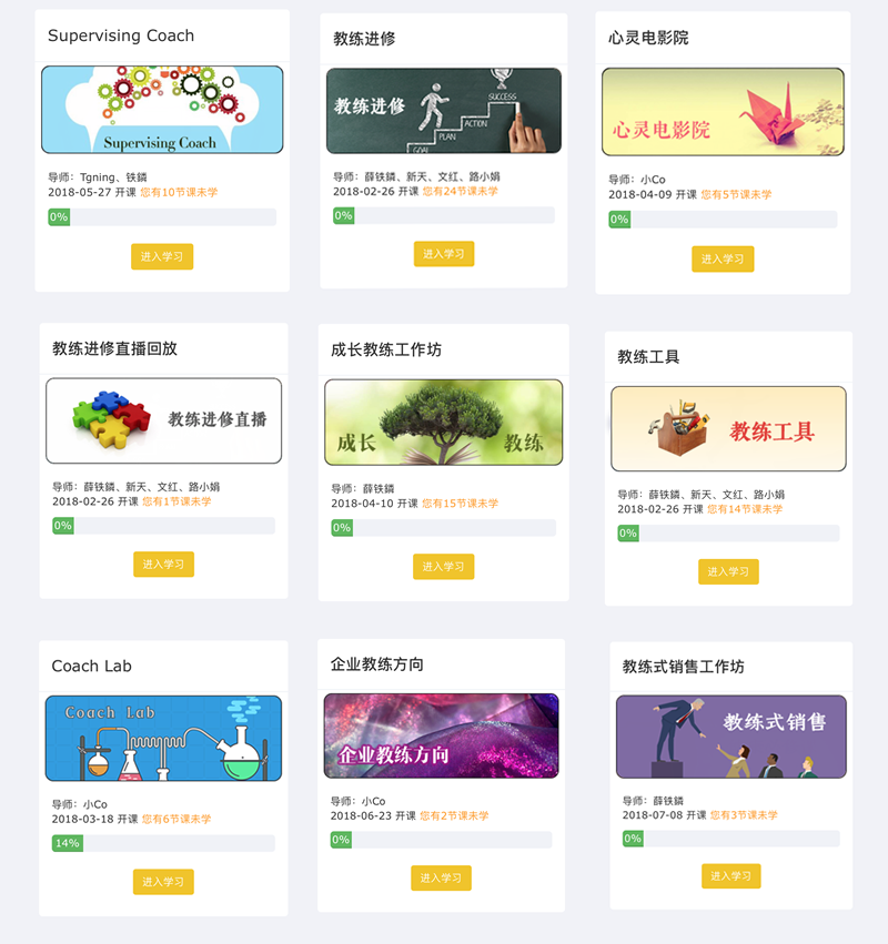 教练工具 【录播】《视觉化》 教练工具 【录播】《ORID教练法》 教练工具 【录播】《隐喻教练》 教练工具 【录播】《GROW模型》 教练工具 【录播】《教练信念与学习进程》 教练工具 【录播】《不同位置的感知》 教练工具 【录播】《幸福四象限模型》 教练工具 【录播】《如何匹配客户的程序》 教练工具 【录播】《魔法提问工具箱》 教练工具 【录播】《度量式提问》 教练工具 【录播】《成果检视模型》 教练工具 【录播】《五个基本教练提问》 教练工具 【录播】《生命转身之重塑信念》 教练工具 【录播】《高级视觉转换之与高我对话》 教练进修 【教练能力】瞬间亲和力 教练进修 【教练工具】隐喻教练 教练进修 【教练基础】心理防御机制 教练进修 【教练基础】真相与假象 教练进修 【教练能力】行动与拖延 教练进修 【教练基础】客户的责任感 教练进修 【教练能力】放下评判 教练进修 【教练基础】教练的四个层次 教练进修 【教练能力】到底什么是反应?什么是回应? 教练进修 【教练事业】关系教练 教练进修 【教练模型】ORID提问法 教练进修 【教练能力】教练会谈中的架构 教练进修 【教练模型】nlp神经语言程序学 教练进修 【教练能力】 怎么做到尊重? 教练进修 【教练事业】Project Coaching 教练进修 【教练模型】生命平衡轮 教练进修 【教练能力】怎么付诸行动? 教练进修 【教练基础】教练过程中的能量 教练进修 【教练事业】教练技术与销售 教练进修 【教练模型】认知行为治疗CBT ......更多内容请进入学习系统查看 |
