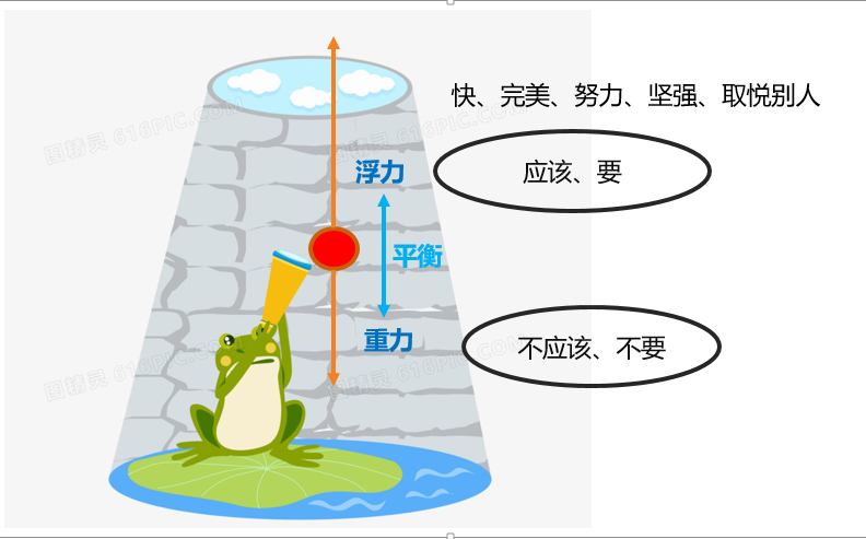 井剧本分为浮力和重力,浮力是指人的信念中要快、要完美、要努力、要坚强、要取悦别人的信念。