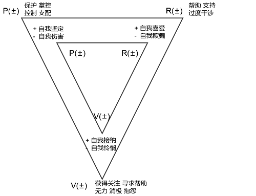 可如果我们仔细观察,就会发现他其实在通过牺牲自己的行为(V+),让家庭关注点从其他问题转移到了他身上,因此他是家庭稳定的拯救者(R+)。他只是通过扮演迫害者的角色,让大家注意到了问题的根源(P+)。