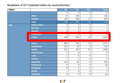 截至2023年4月13日,ICF统计中国ICF认证教练证书持有者1360人,其中ACC教练508人,PCC教练816人,MCC教练30人。