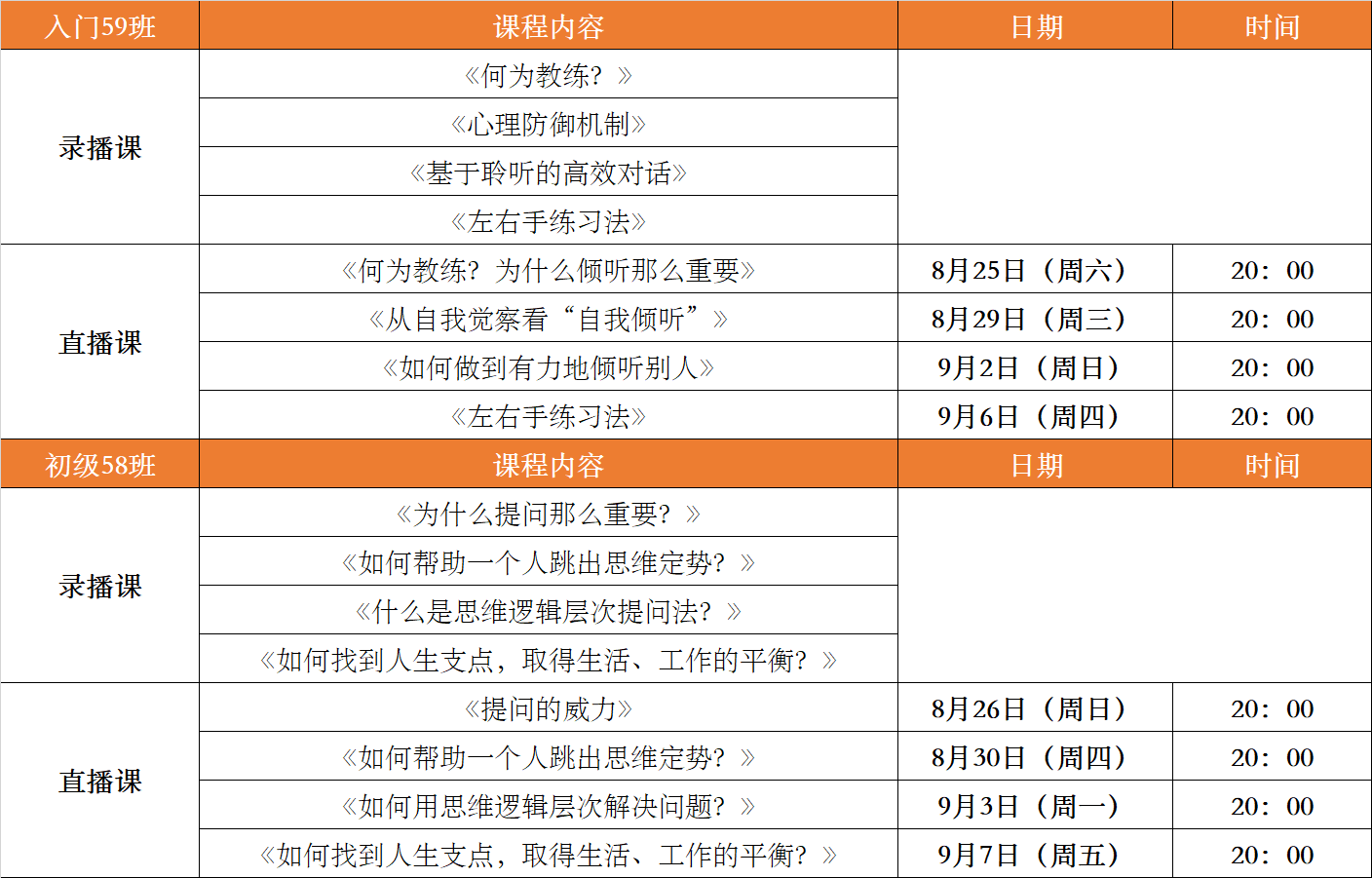 2018年8月入门、初级班课程时间安排表