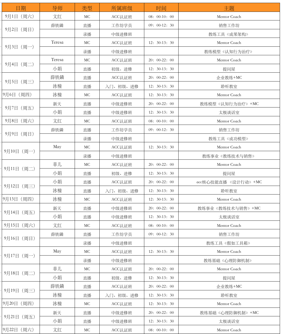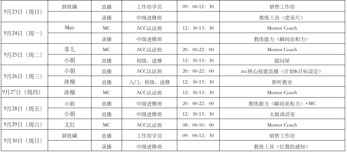 2018年9月进修、认证班课程时间安排表