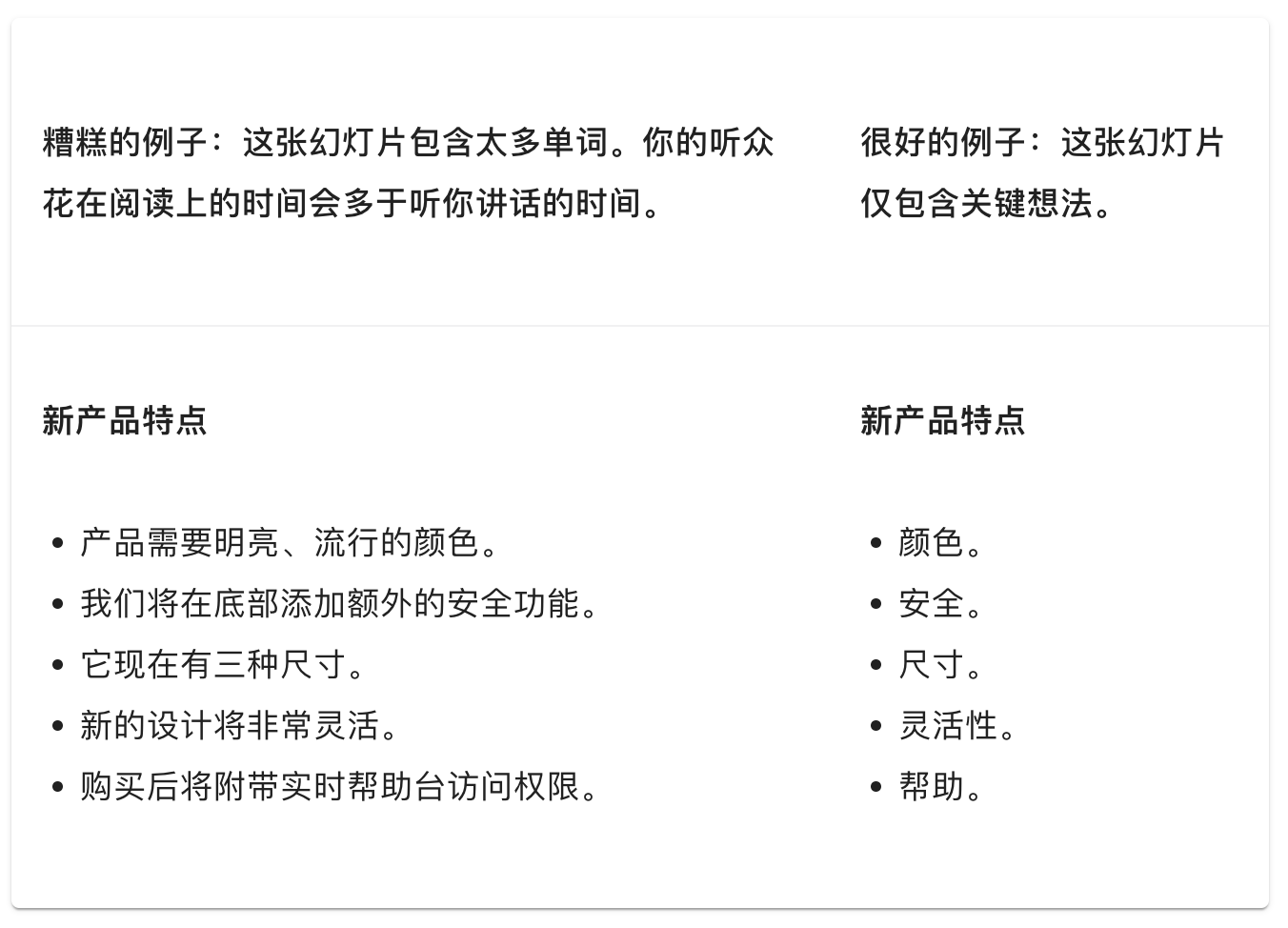 - 您正试图说服董事会支持新产品创意。您的幻灯片从上到下由图表、数字和文本块组成,董事会成员大部分时间都在阅读幻灯片而不是听您讲话。结果?你没有建立真正的联系,他们也失去了你对这个项目的热情。他们一致投票不同意这个想法。