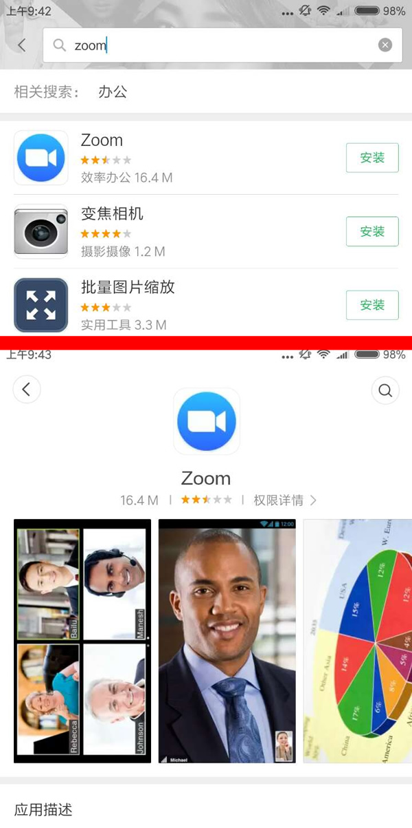 iphone、ipad请登陆app store(手机下载商店),搜索Zoom即可以看到Zoom软件(如下图),会看到以下图片(ZOOM Cloud Meetings)点击下载