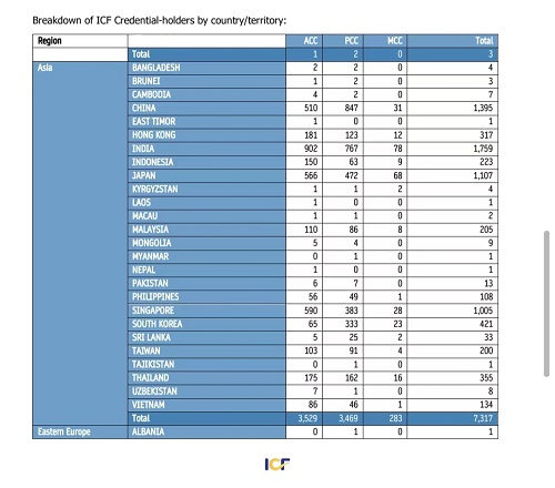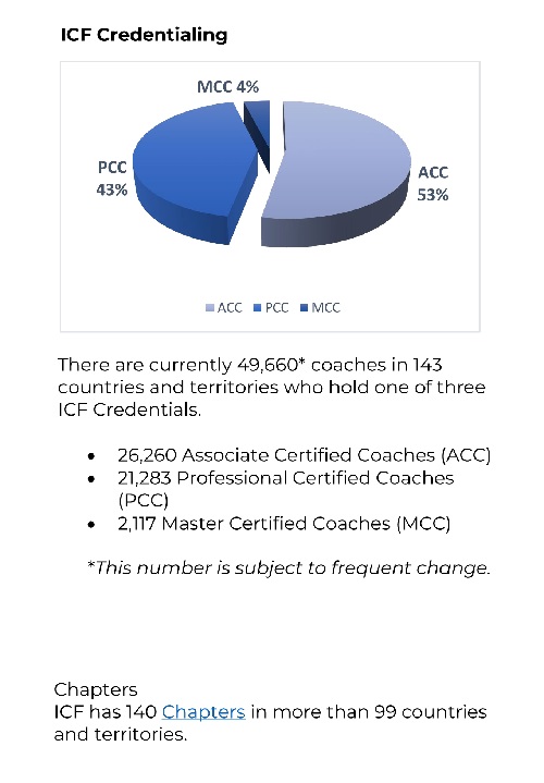 ICF将“教练”定义为与客户在发人深省和富有创造性的过程中进行合作,激发他们最大限度地发挥个人和专业潜力。 (以下数据都是截止到发稿日的统计,数量会随着日期的变化而发生变化。)