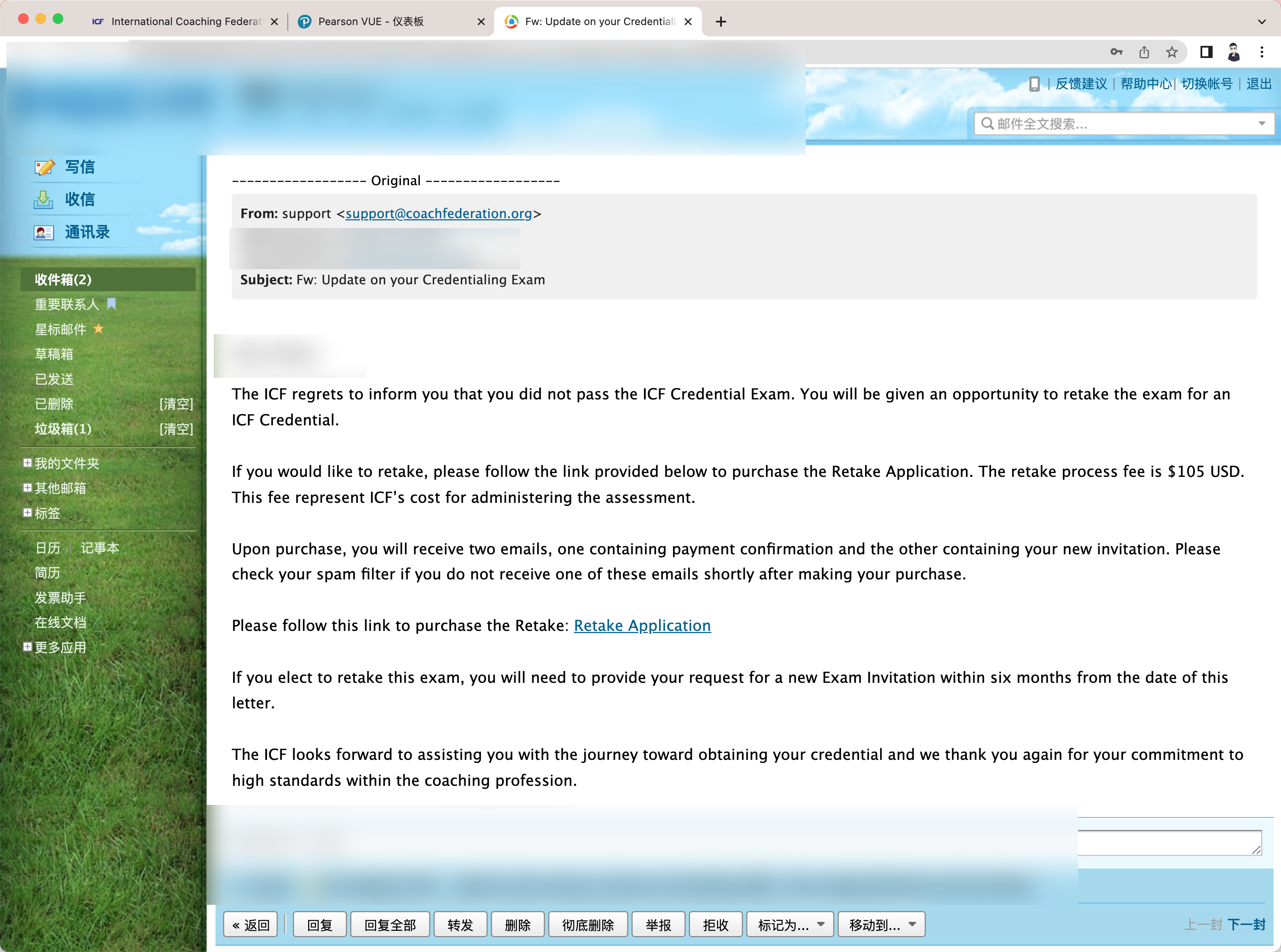 首先,retake之前你必须参加过一次考试,并且没有通过。于是ICF可能会隔几天就会给你发一封邮件,邮件大致的意思就是你们通过需要重新申请考试(这个申请是缴费的,费用是105美金)。邮件如下图,邮件里面有一个链接地址,上面写着Retak Application,点击进入。(图后会继续详细说明步骤)