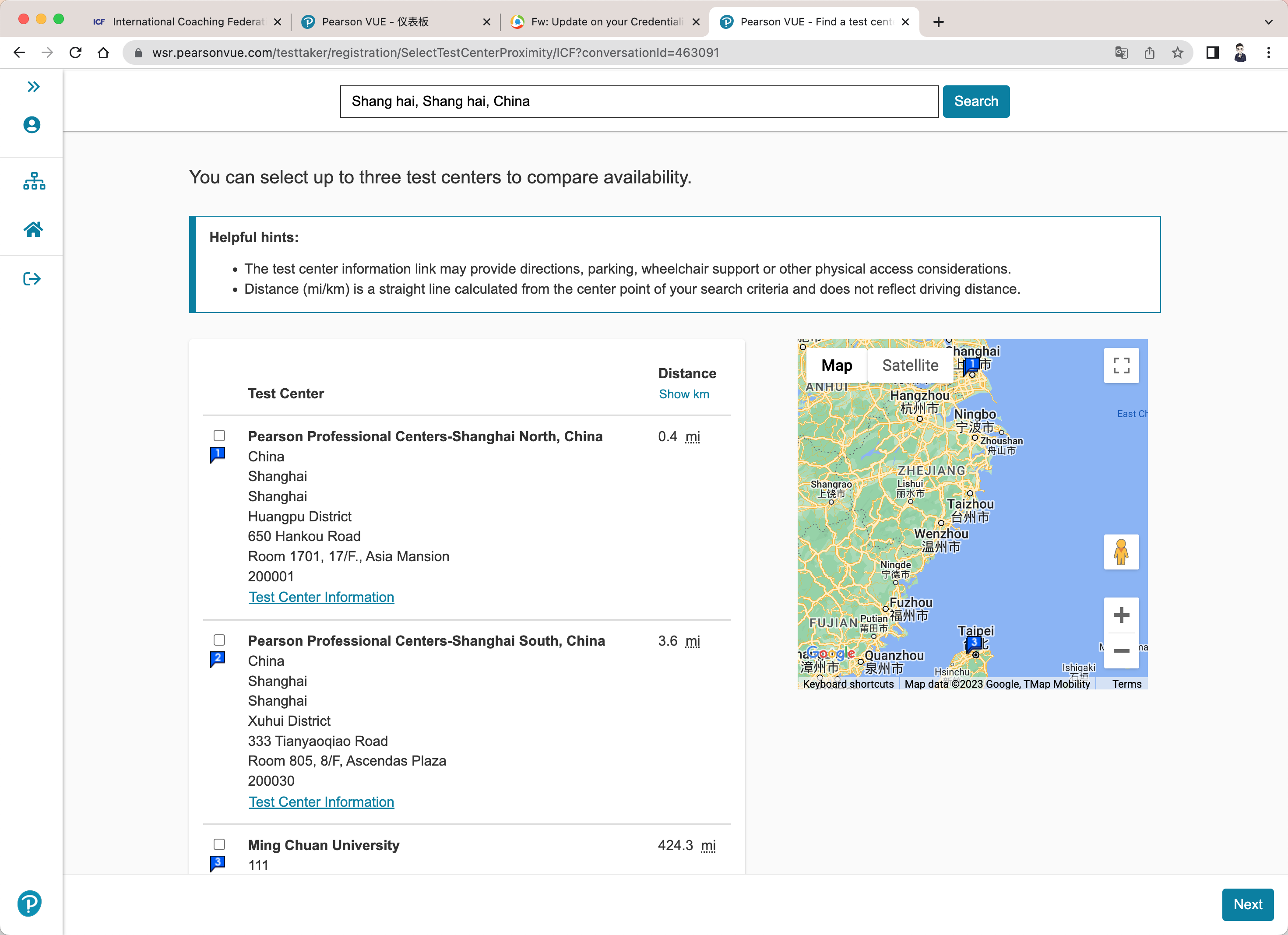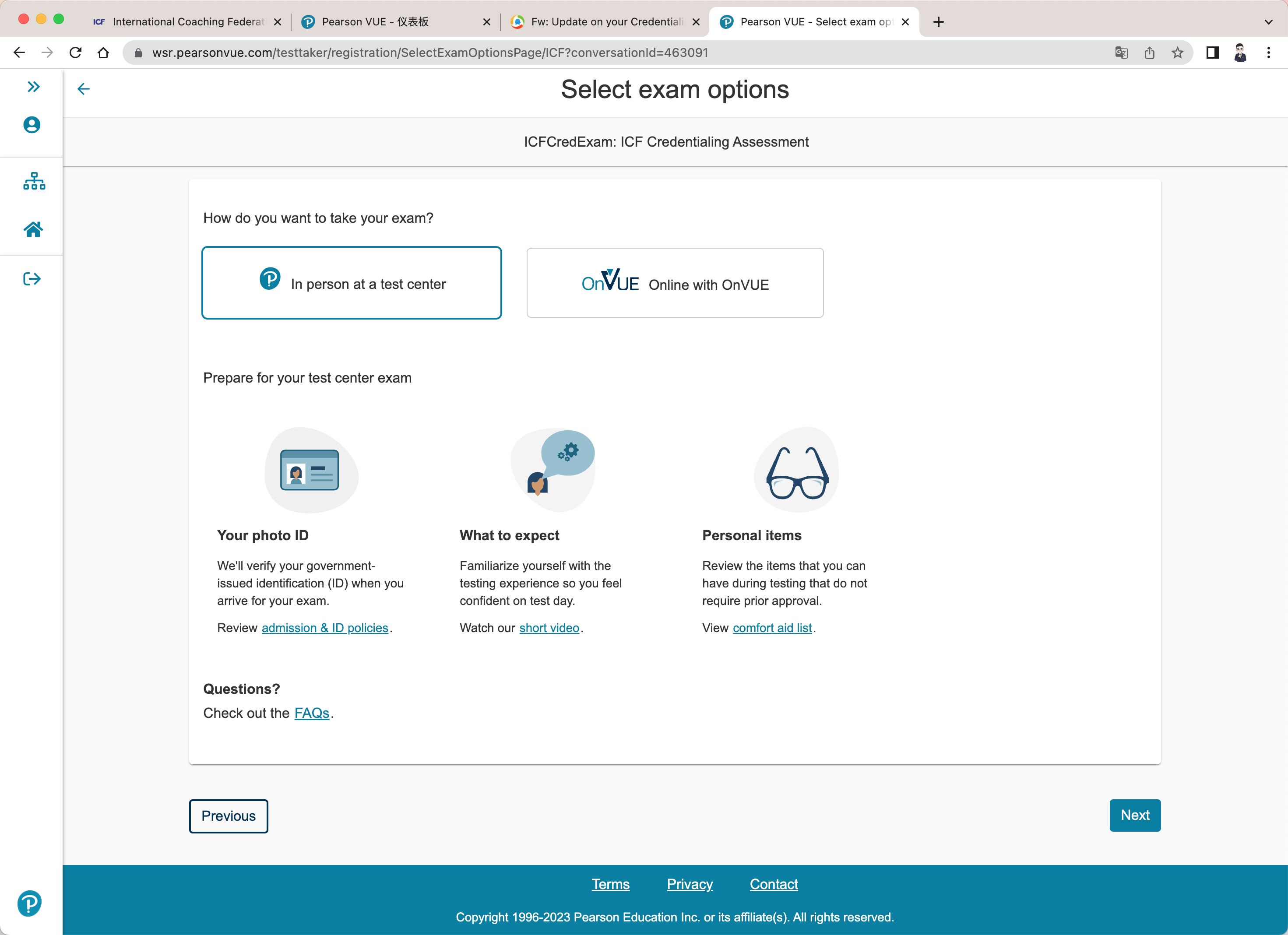 点中间的第一个图标位置的”in person at test center“文字按钮进入,然后点”next“按钮(图后会继续详细说明步骤)
