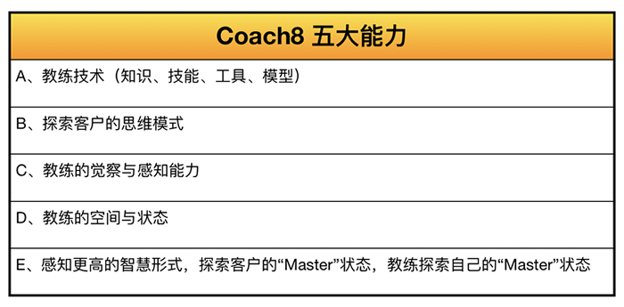 Coach8的课程设计是根据ICF要求的《11项核心技能》为基准,同时结合Coach8所设计的五大能力训练方向,设计出的一套综合训练专业教练的课程。Coach8的课程主要包括五大模块:第一模块主要是基础课程,第二模块是教练能力的提升,第三模块是ACC级别的工作坊(全面解析教练的过程),第四模块是精雕细刻PCC级别教练的能力,第五模块是PCC级别工作坊(通过长时间训练提升教练的教练状态和教练能力)。以下为:ICF《11项核心技能》、Coach8设计的五大能力,和相应的课程设计所对应的ICF核心能力及Coach8要求的五大能力表。