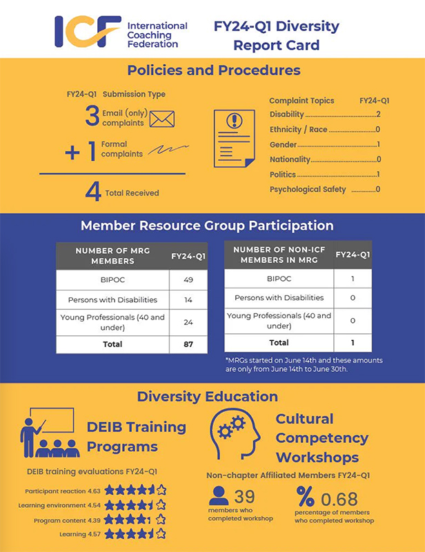 在进行多元化审计后,ICF 确定了 2024 财年的四个 DEIB 有意义的重点领域和目标。为了在我们实现这些目标的过程中提高透明度,DEIB 发布了一份季末成绩单来展示我们的进展。这些领域经过战略性开发,以确保我们以 ICF 运营和利益相关者两种身份创建一个包容且公平的教练社区。