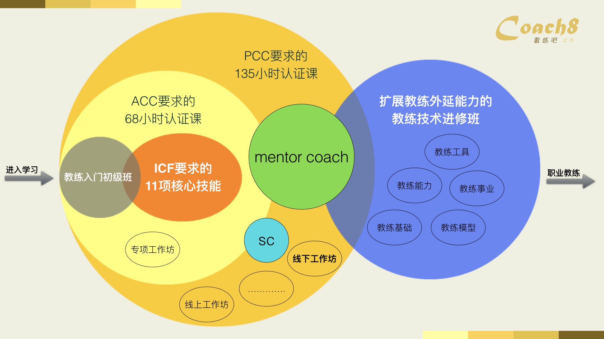 ICF认可的国际认证证书ACC、PCC一直都是学习教练的人首要拿到的业界认可的证书。但是由于教练本身是一门对人的能力检验的课程,所以和我们以往学习的方式和考核的方法都不太一样。有的培训机构运用传统的教学方式,树状结构讲解(按照章节的顺序),有的则是按照模块化的新型模式讲解(点状最后汇集成总的)。两种模式各有利弊,Coach8选择的模式是模块化模式,也就是说学员可以随到随学,像大学选修课一样修学分的方式。这样的好处就是不死板,而且可以让学员重复免费的听课,节省时间也大大加强了学习的效率。不过模块化学习的一个缺点就是刚开始的时候不容易摸到规律,所以初学者进入Coach8学习系统通常都会带来一定的困惑。基于此,我录制了上面的视频,也编写了底下的文字,希望通过学习可以帮助初来乍到,或者一直想更有效率学习的学员掌握学习的方法。这里要强调一下,我只是介绍我认为有效率的方法,但是不一定是最终解决方案,每个人都可以根据我们的课程情况设置自己的学习节奏和计划,这样才是最科学的学习方法,也是我们倡导的!祝你学习愉快!