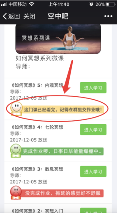 2、当你点击完“已学打卡”之后,这 课的状态会变成灯状态