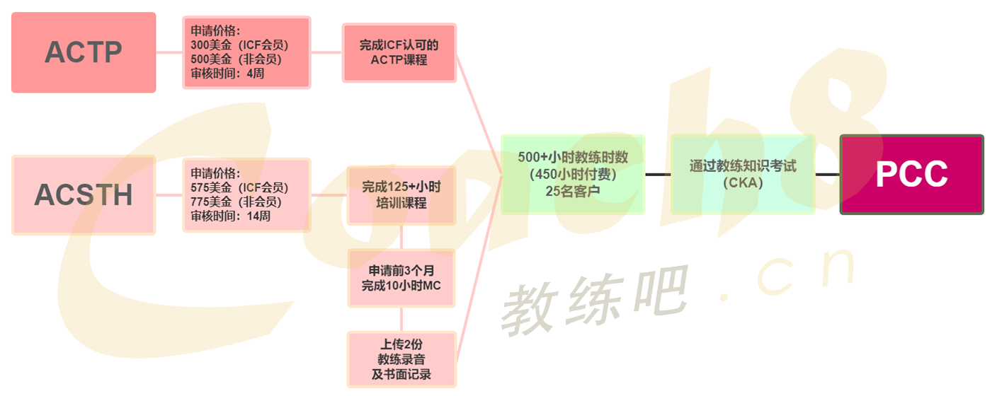 从下面两张申请ACC和PCC的流程图可以看出,相比ACSTH而言,学员通过ACTP申请ACC和PCC,价格更低、审核时间更短、MC时长和提交材料更少。