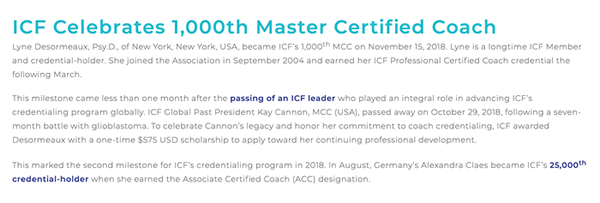 2018年11月15日成为ICF的第1000位MCC(大师级的教练)。莱恩·德索尔莫克斯(Lyne Desormeaux, Psy.D.),美国纽约州精神病学博士,Lyne是ICF的长期会员和证书持有者。她于2004年9月加入ICF,并于次2005年的3月获得ICF职业教练资格认证证书。