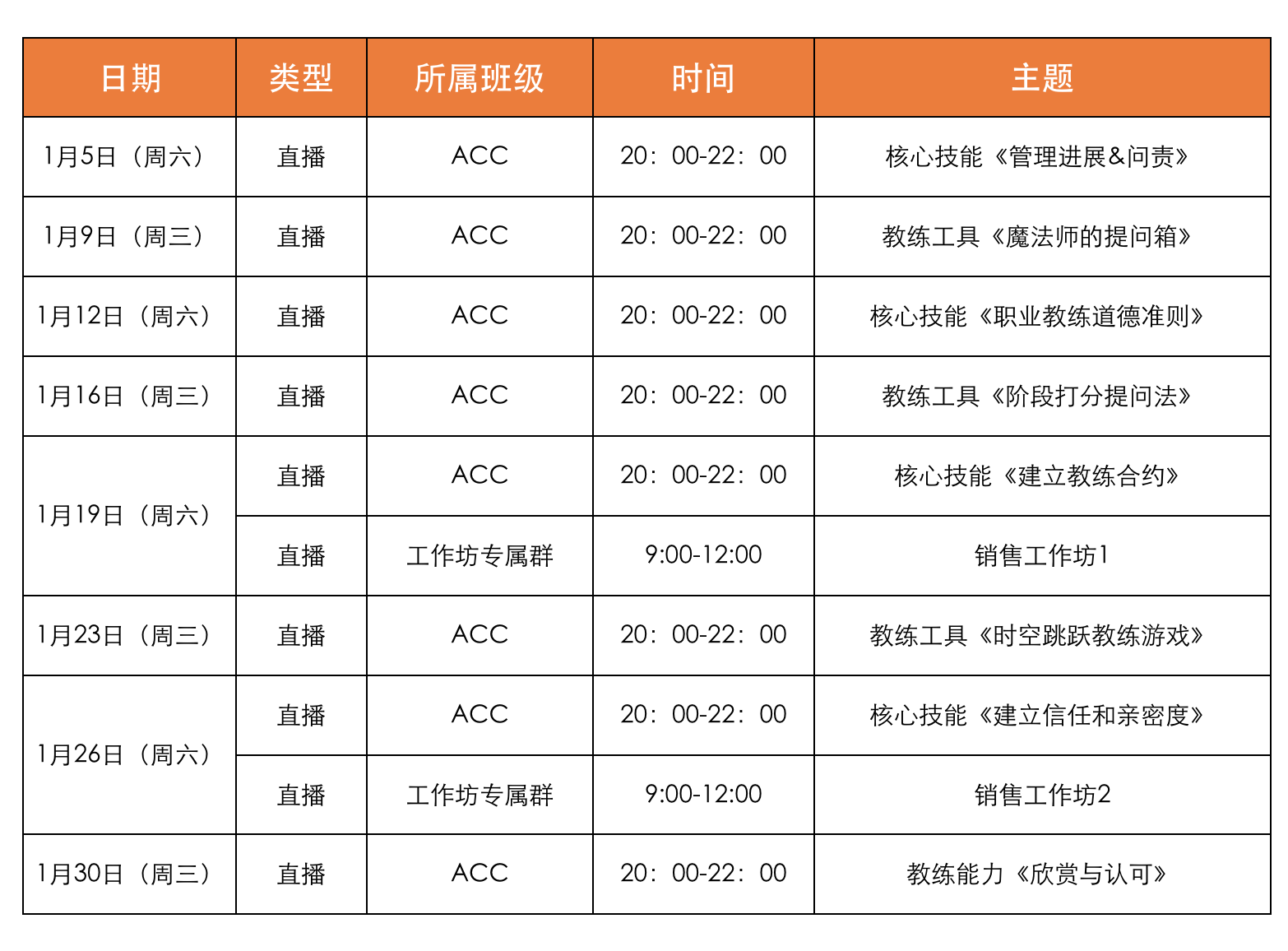 2019年1月中级进修、ACC认证班必修课程时间安排表