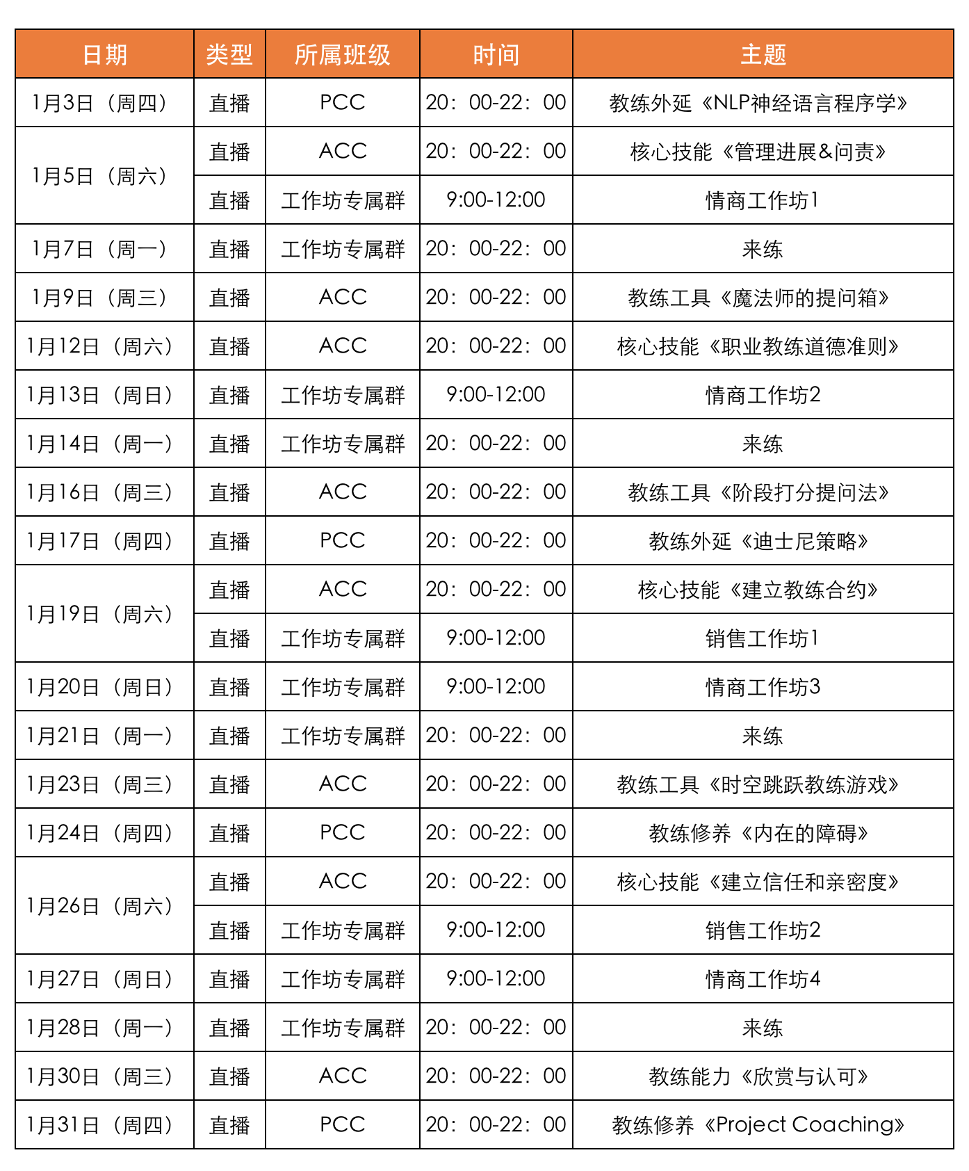 2019年1月高级进修、PCC认证班必修课程时间安排表