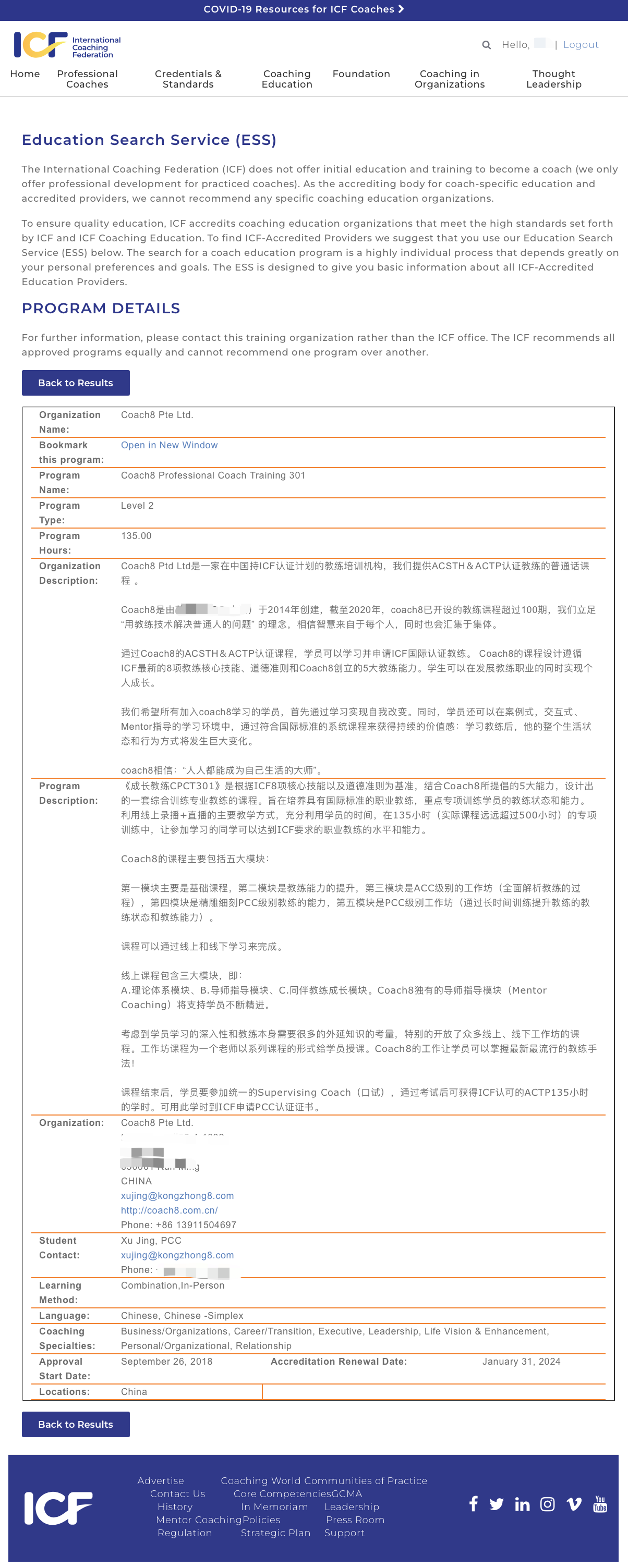 Coach8国际认证课程CPCT301在ICF的官网的登记信息