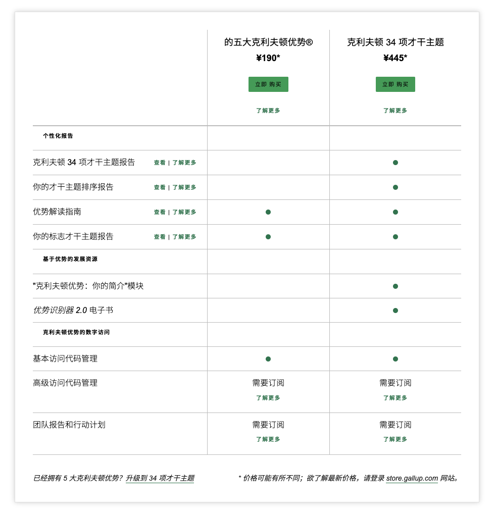 购买克利夫顿优势 34 个才干主题报告( 或者升级你现有的克利夫顿优势帐户 ),以接收这份前所未有的报告,了解自我以及如何最大限度发挥自己的无限潜能。