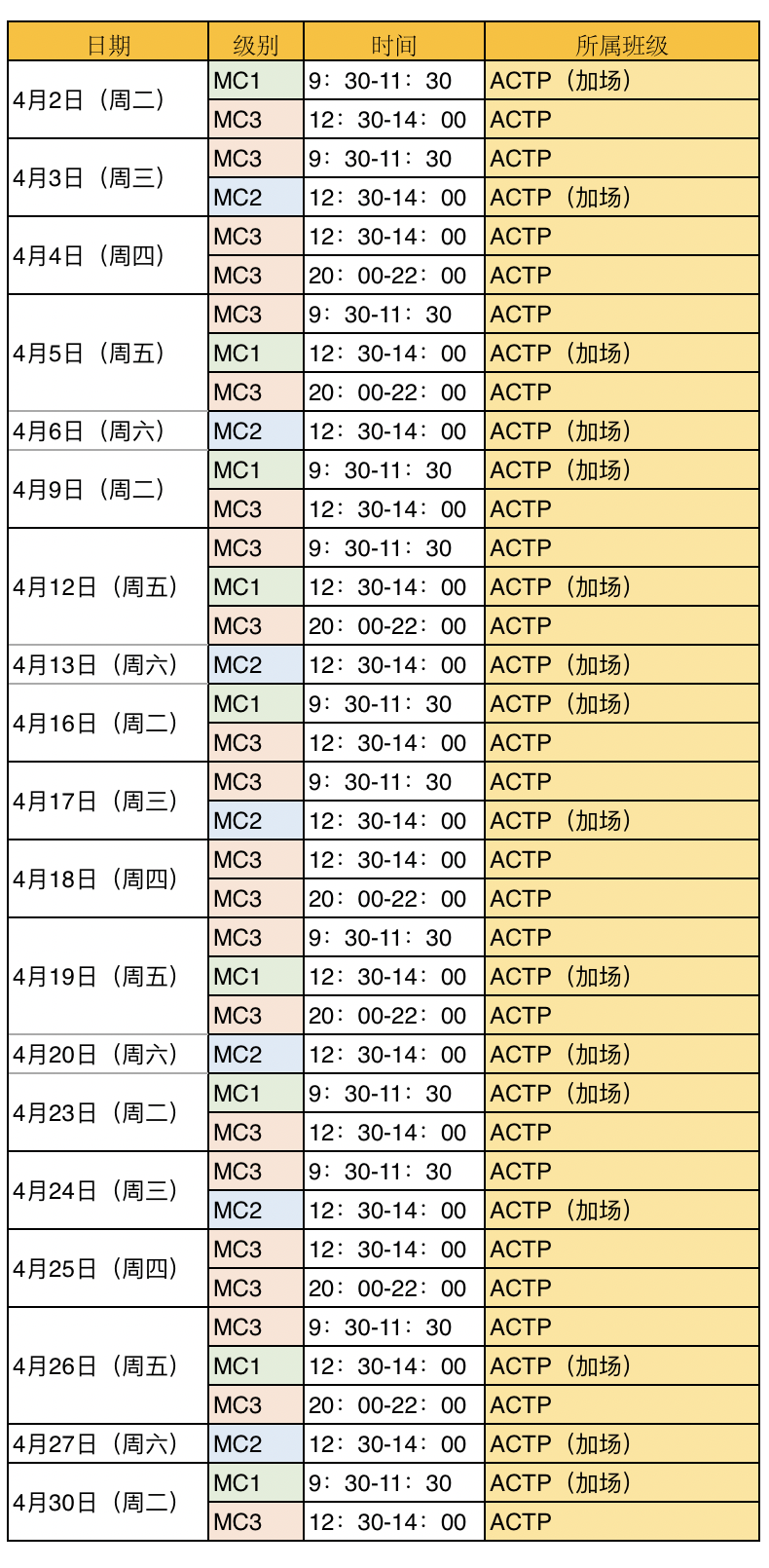2019年4月MC3及MC(加场)课程时间安排表(ACTP专用)