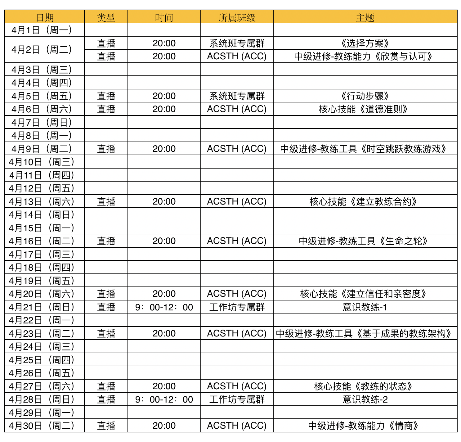 2019年4月中级进修、ACC认证班必修课程时间安排表