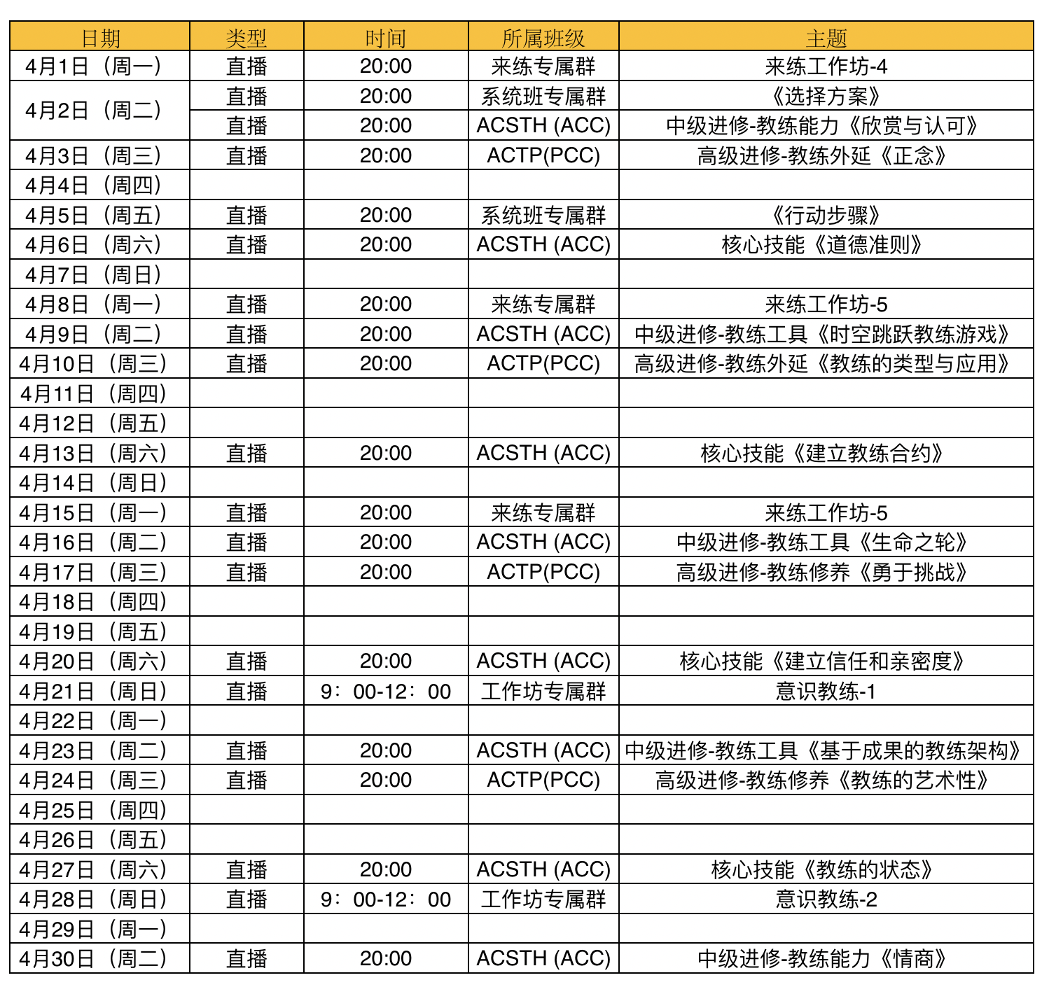 2019年4月高级进修、PCC认证班必修课程时间安排表