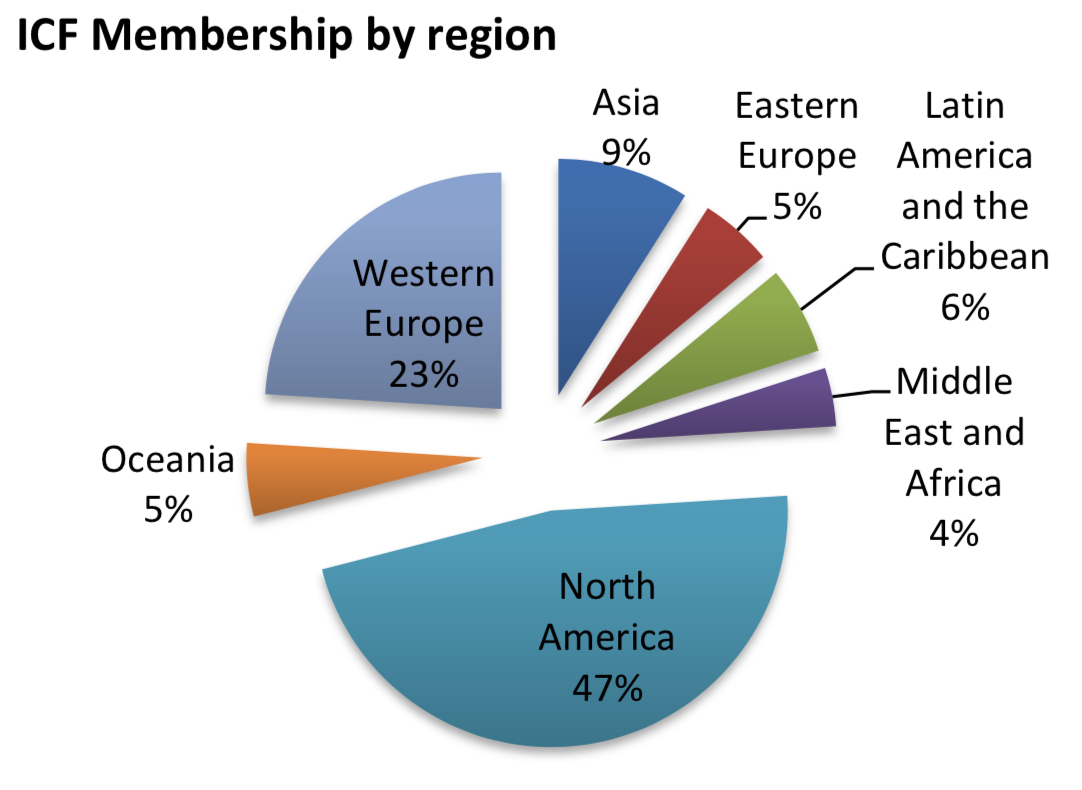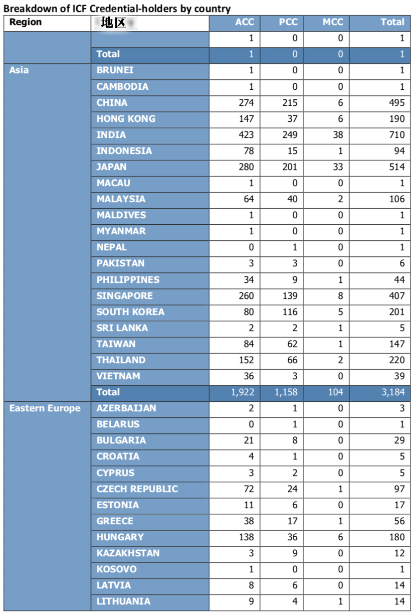 成立于1995,国际教练联合会(ICF)是全球领先的组织,致力于通过制定高标准,提供独立的认证,并建立一个世界范围的证书教练教练网络。ICF寻求推进专业教练的艺术、科学和实践。ICF将教练定义为与客户合作的一个发人深省和创造性的过程,激励他们最大化他们的个人和专业潜力。(以下数据都是截止到发稿日的统计,数量会随着日期的变化而发生变化)
