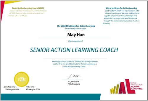 Coach8的资深教练导师韩若梅(May)老师,作为获得ICF多年认证的PCC教练、DDI认证绩效管理引导师、美国项目管理协会专业项目管理师(PMP)和美国脑神经语言程式大學认证NLP执行师,此次通过国际行动学习协会认证,从专业行动学习教练(PALC)升级成为高级行动学习教练——SALC(Senior Action Learning Coach),她将会培养更多的团队教练,为团队合作和组织变革,带来更多积极而深远的影响。