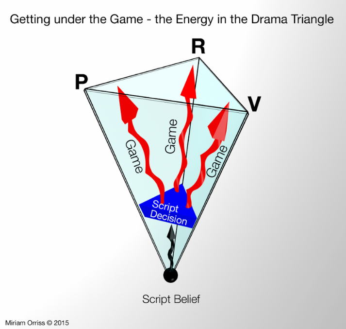 正如前面所说的,卡普曼戏剧三角用于描绘两个或更多人之间的相互作用和行为“移动”,并与个人的脚本信念和重复的无意识行为重复模式相关。 上面这个图的目的是显示“三角形中的能量”,并以图解方式显示剧本的信念和决策,以及由个人内部能量驱动的无意识行为模式——如何形成戏剧三角形。
