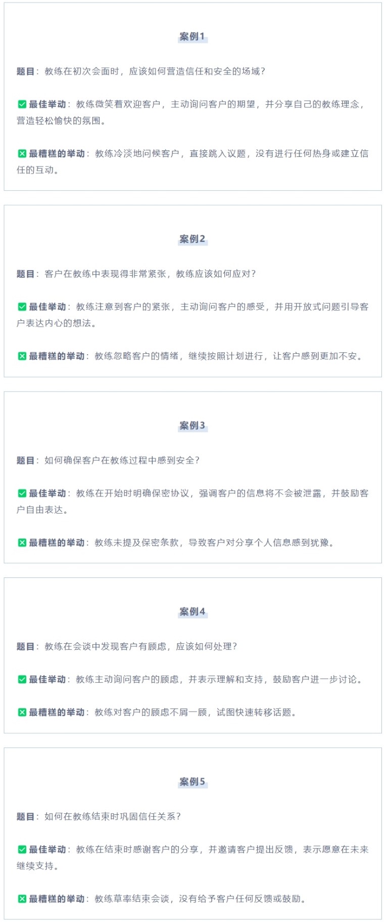 为了更好地理解建立信任和安全感这一核心技能,接下来我们将通过ICF认证考试中的一些案例题目来探讨最佳和最糟糕的做法。