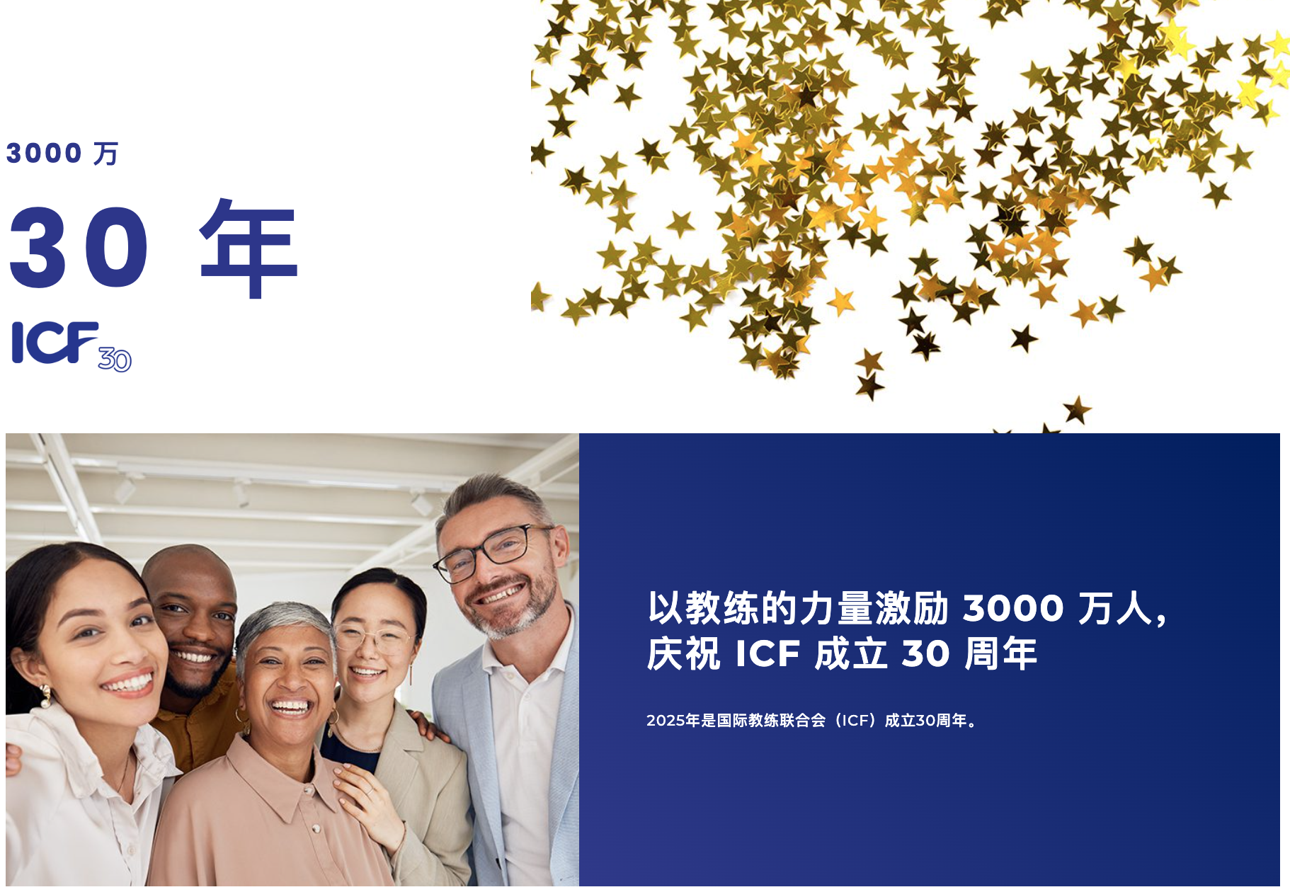为了表彰 ICF 社区在过去 30 年中产生的广泛影响,我们设定了一个目标,即今年通过教练的影响力激励 3000 万人的心灵。