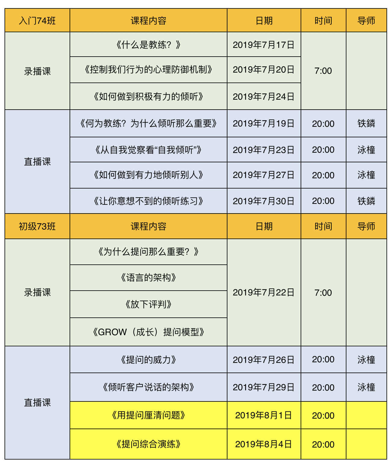 2019年7月入门、初级项目时间安排表