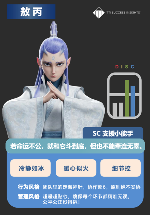 Dennis对敖丙有一句很经典的评价:“SC型的人总是给人一种‘安心’的感觉。他们在团队里就是那种‘润物细无声’的存在,既能把细节做得滴水不漏,又能用温暖的态度照顾团队的情绪。”