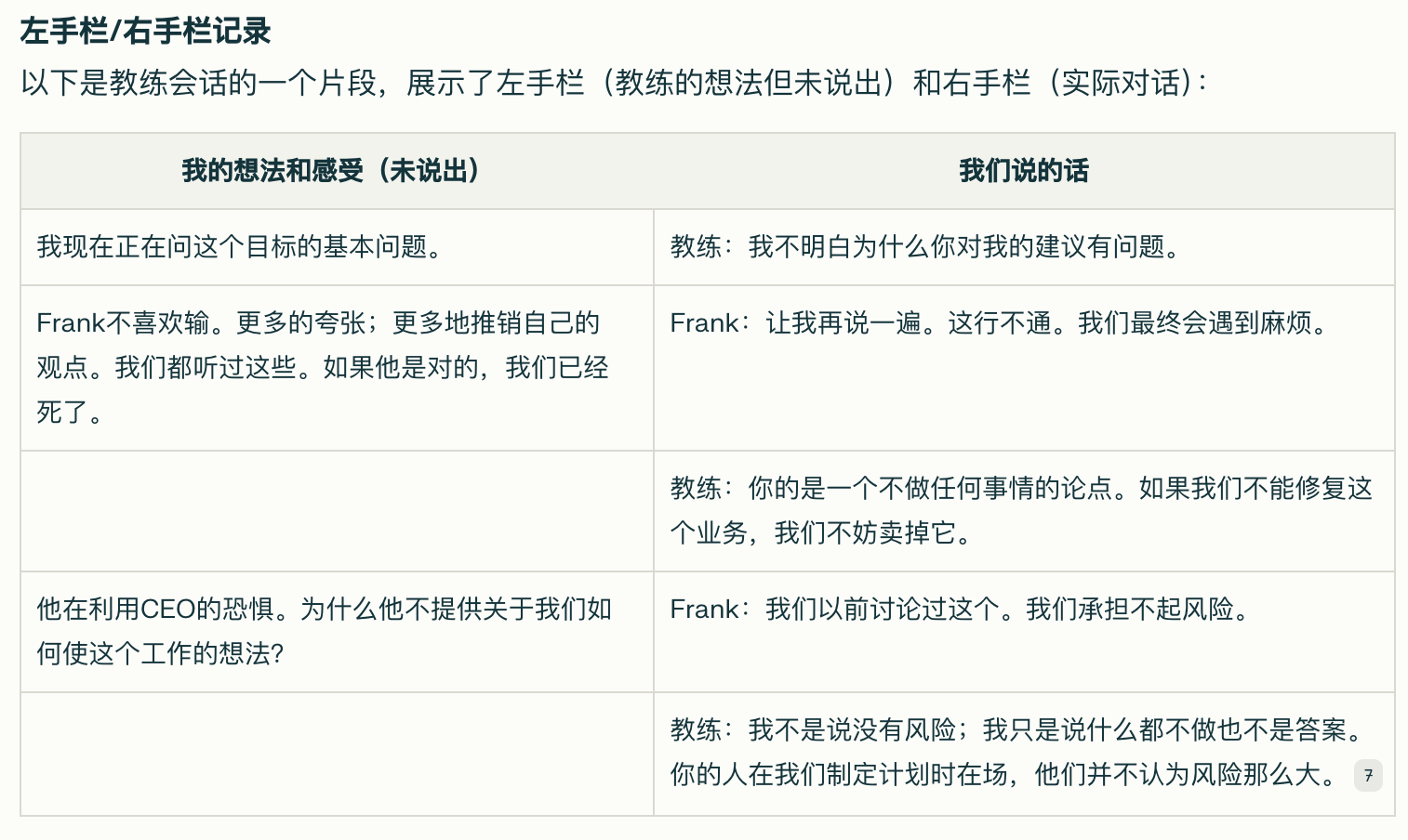 以下是教练会话的一个片段,展示了左手栏(教练的想法但未说出)和右手栏(实际对话):