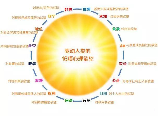 ➤16项欲望:我们一般是通过这16项需求当中,寻找伴侣,也会借此更加了解自己,我们对于别人对我自己的接纳程度有了多少的需要。