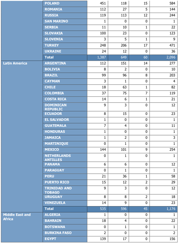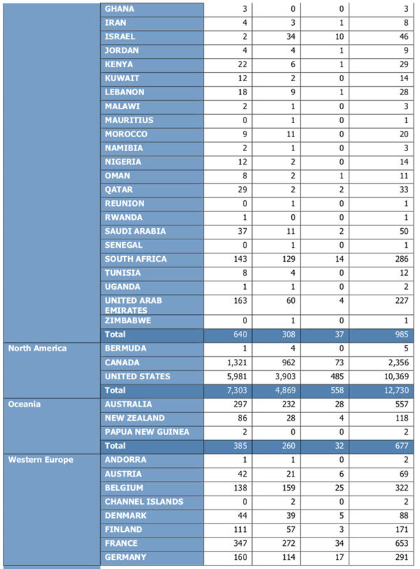 ICF认证教练按照国家和地区分类情况如下