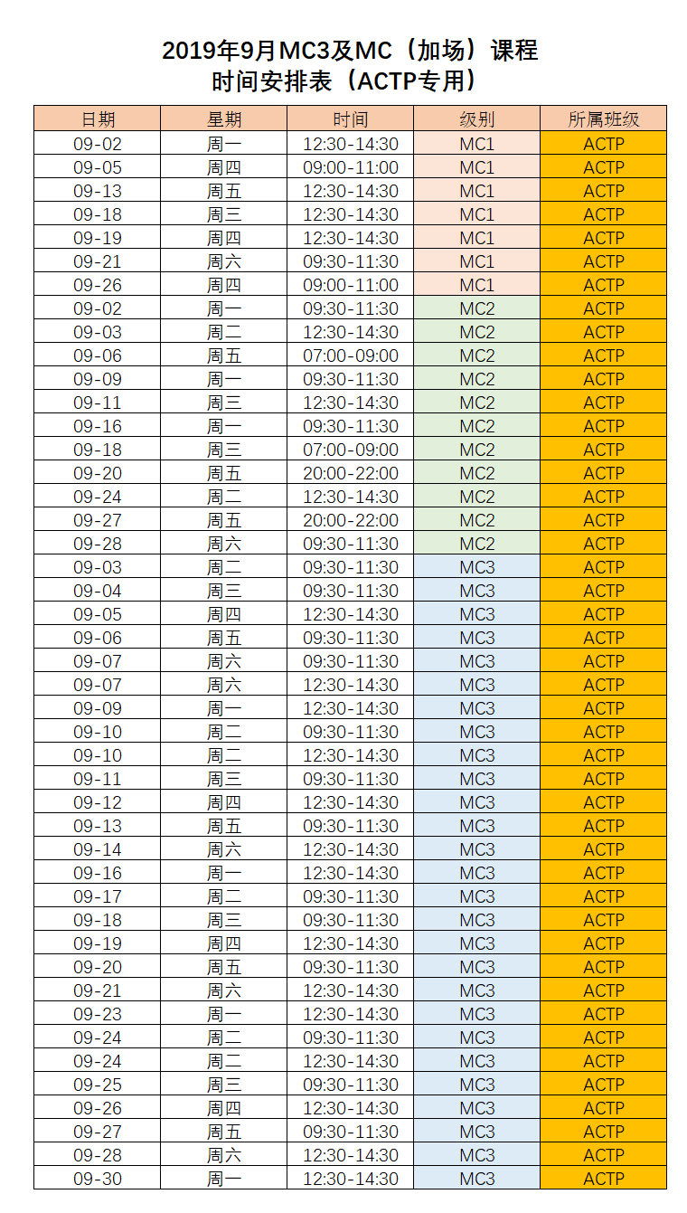 2019年9月MC3及MC(加场)课程时间安排表(ACTP专用)