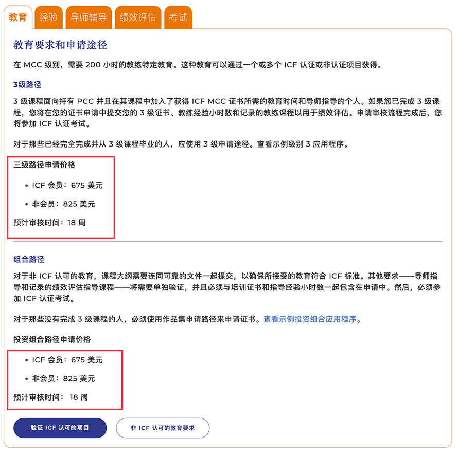投资组合途径的学员(申请难度较大)申请费用:ICF会员 675美金 非ICF会员825美金