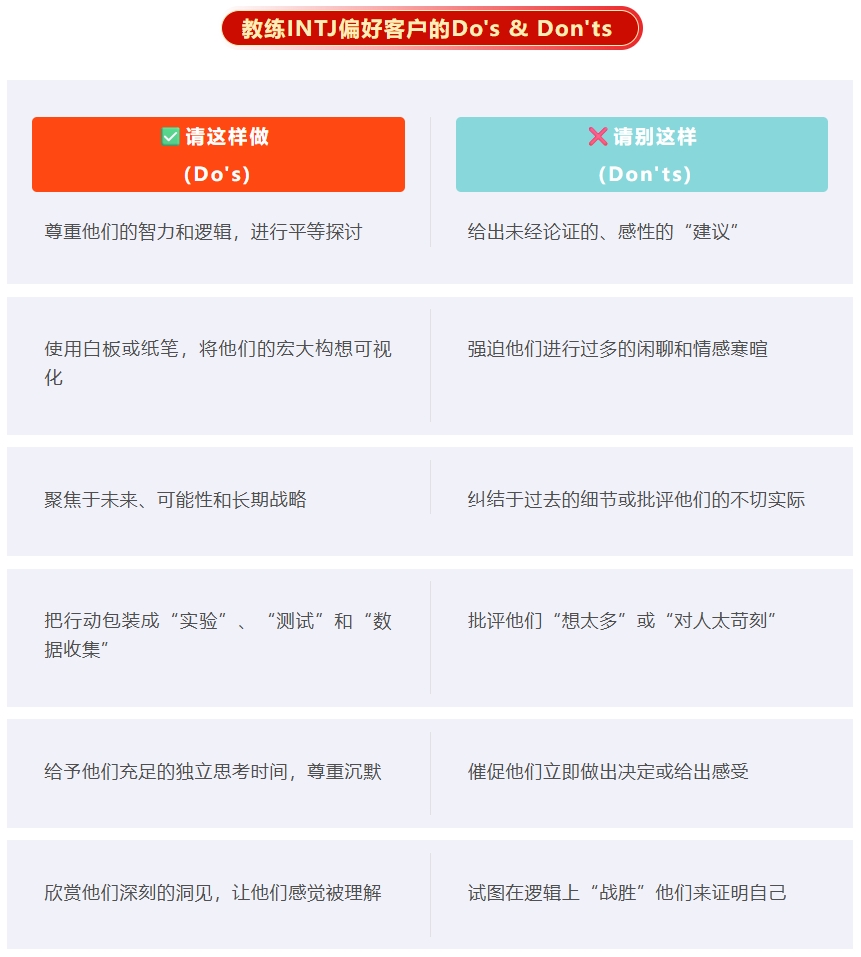 教练INTJ,你需要成为一个能与他进行智力对等交流,同时又能帮他把目光从“星辰大海”拉回到“脚下土地”的战略伙伴。
