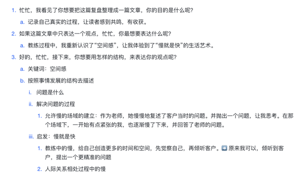 是教练过程中,我从客户的表达中抓到了更多的信息,有自己的观点,有对客户的好奇,因为想要快点「给」到客户一点什么,最后被我暴力地揉成了一个不知道是啥的“团子问题”丢给了客户,没有逻辑,没有结构。