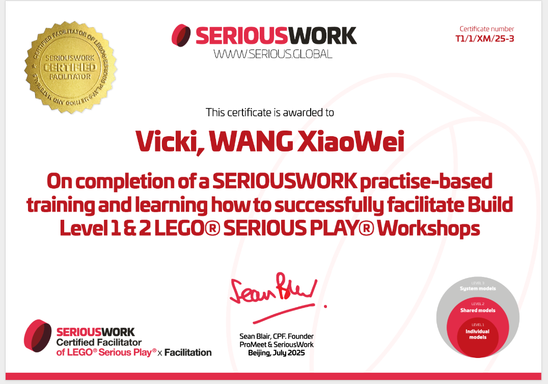 2025年的7月,我接受了麻晓晴老师在北京举办的,LEGO®Serious Play®技术核心引导能力培训,并在9月拿到了相应的认证证书。