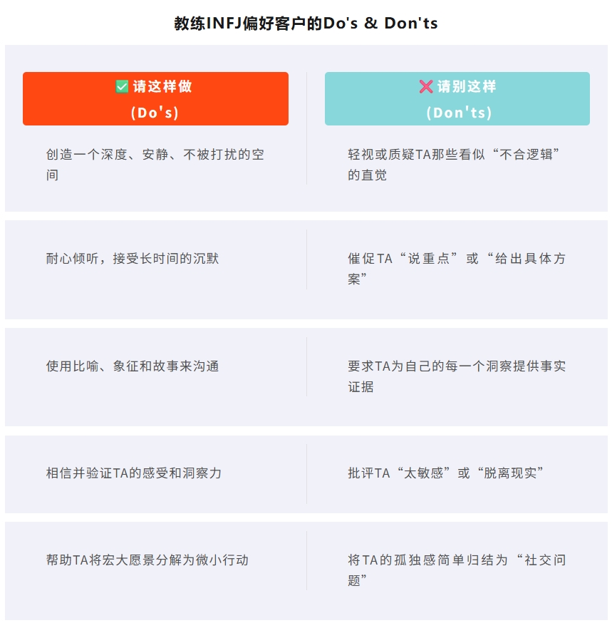 a. 为何有效:我们放弃了常规的教练框架,直接进入了INFJ最熟悉的、充满象征和意象的语言体系。这等于在说:“我愿意用你的语言与你对话。”
