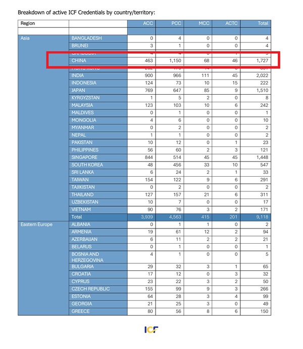 截至2025年9月30日,ICF统计中国大陆地区教练持证人数为1727人,香港地区391人,台湾地区291人。