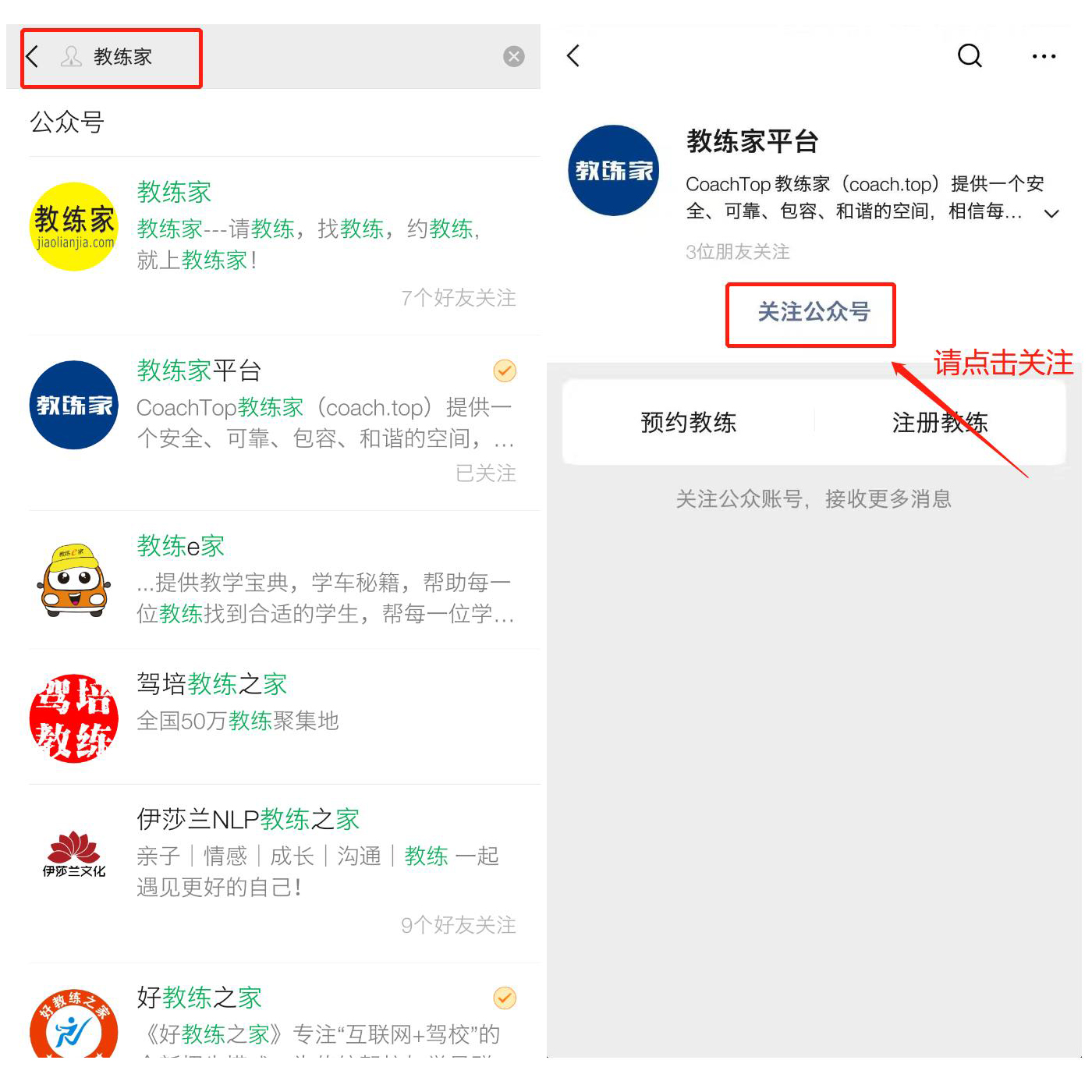 第一步,搜索微信公众号【教练家】并关注;老用户或已经接到邀请链接的客户请直接跳到【第四步】